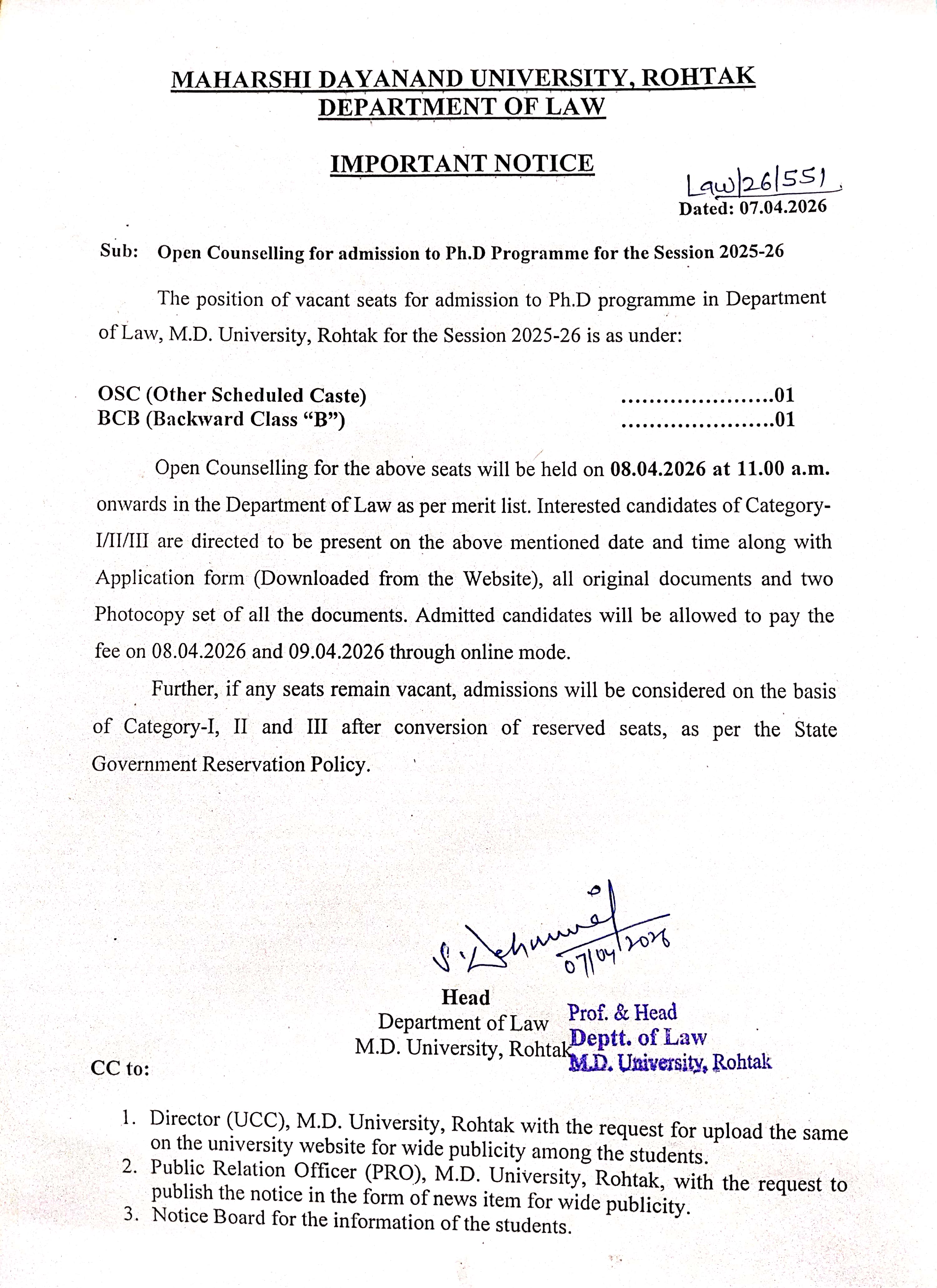 The Attendance of LL.M students for Physical Counselling will be held from 09.00 to 11.00 a.m on 07-08-2019. Merit List will be displayed at 12.00 noon and at 12:00 noon the admission process will start in the Department of Law, MDU Rohtak on 07-08-2019.