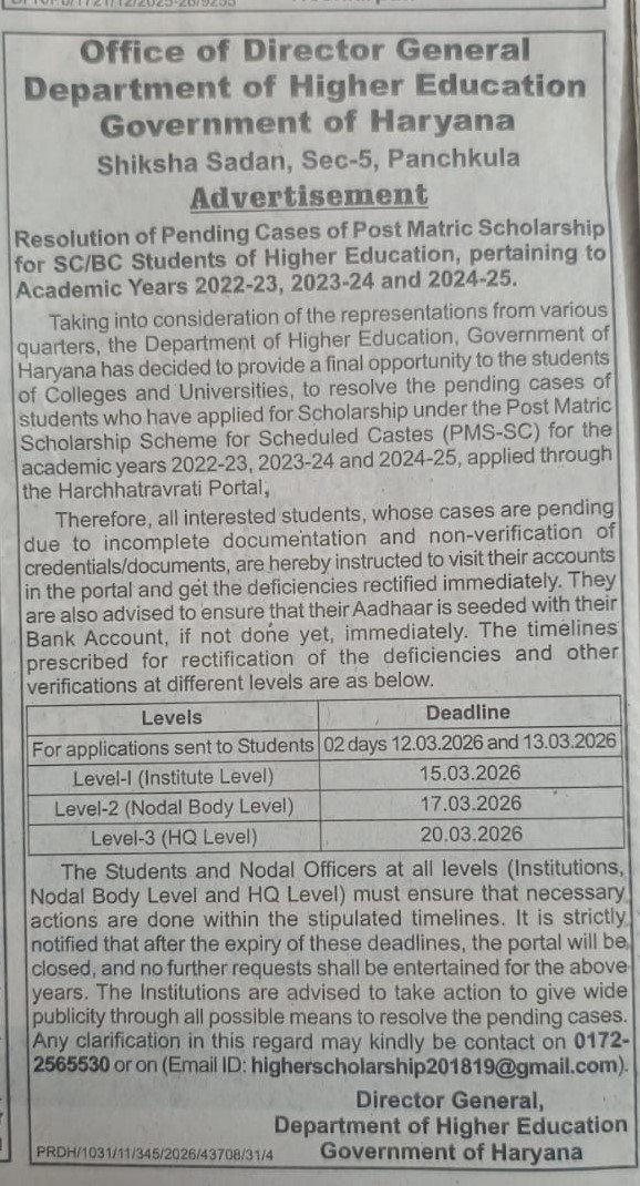 | 10 | Advertisement of Haryana Govt. sanctioned post of Principal on regular basis in C.R.A. College Sonepat. | (49312) | 30 Jan 2026 | Download |
