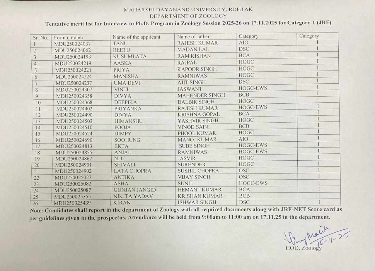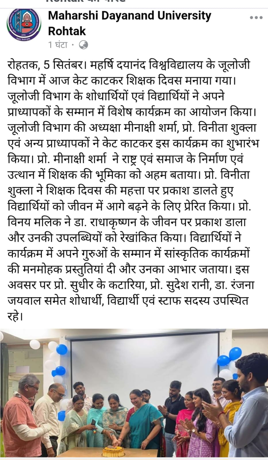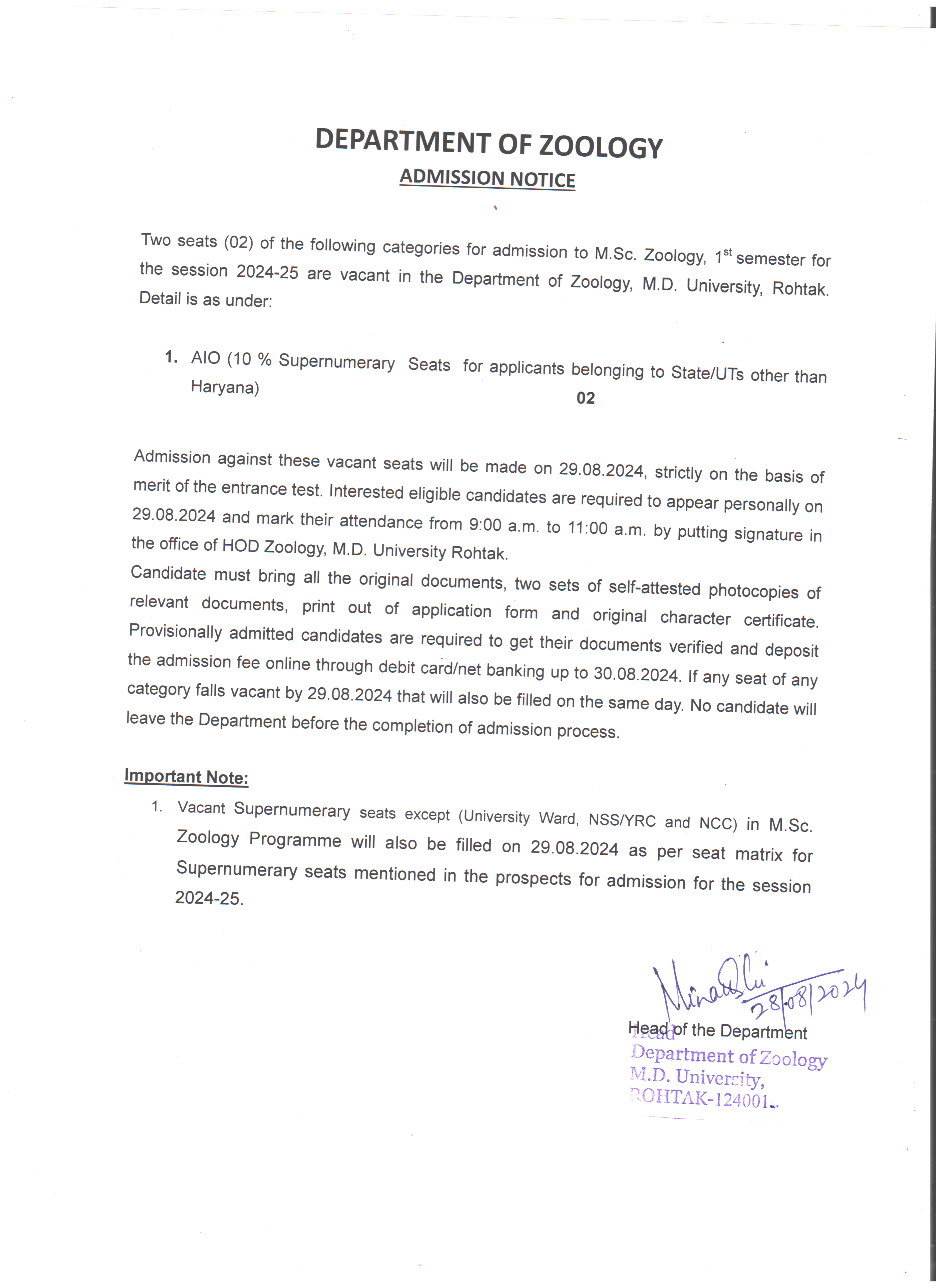 The Department of Zoology came into existence in June 2009. The department has completed 1st Phase of DST-FIST program. The Department offers Post Graduate Course in the subject of Zoology and PhD programme in different areas of specialisation in the latest research areas of life sciences as well as considering social problems. The department has research collaboration in the interdisciplinary research areas with institutes like IGIB, N. Delhi, NII, N. Delhi, NMRI, N. Delhi, PtBDSUHS/PGIMS, Rohtak, Kurukshetra University, Kurukshetra apart from interdepartmental research collaboration. The faculty has more than 200 research publication with an impact factor of 48 (TR), 12 Book Chapters, 06 books, and 06 proceedings of national seminar/conference with ISBN to their credit. The Department has successfully organized 07 National Seminars/Conferences since its inception. The department is actively engaged in research activities and successfully competed several research projects funded by UGC, DST, etc and is equipped with sophisticated instruments like HPLC, Lyophilizer, Gel Documentation system, PCR, Autoclave, UV-VIS Spectrophotometer, Potentiostat, Upright and Inverted Microscope, Deep refrigerator (-86˚C), Biosafety Cabinet etc. The faculty members of the Department are actively engaged in teaching and research to cater the need of the students and society.