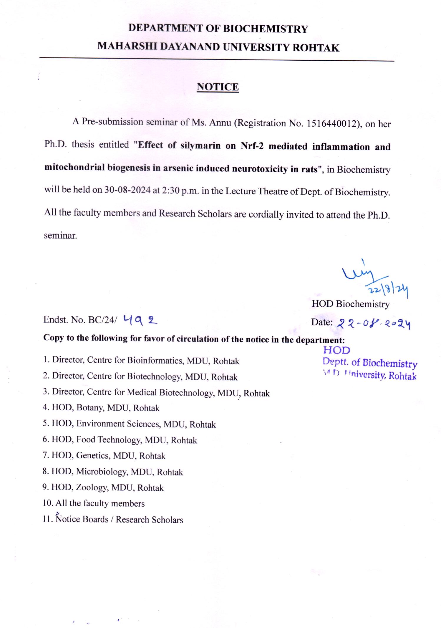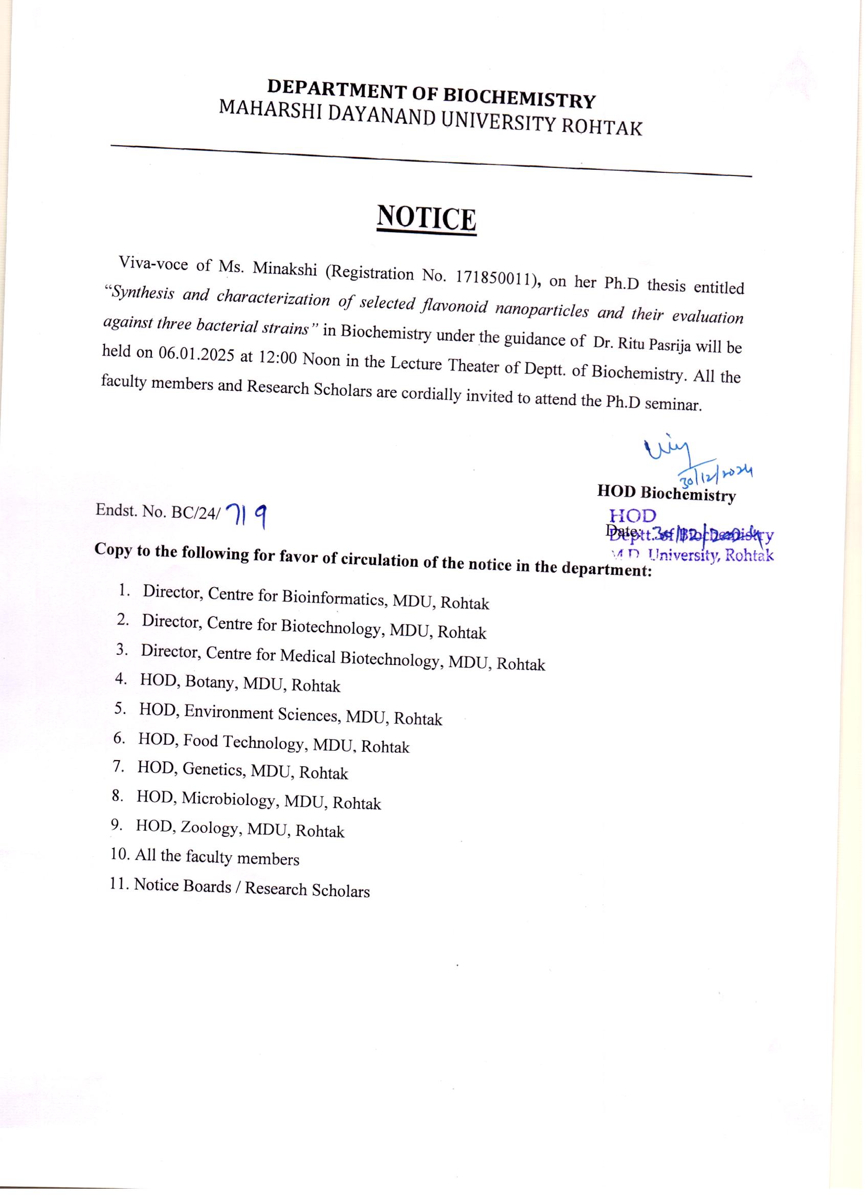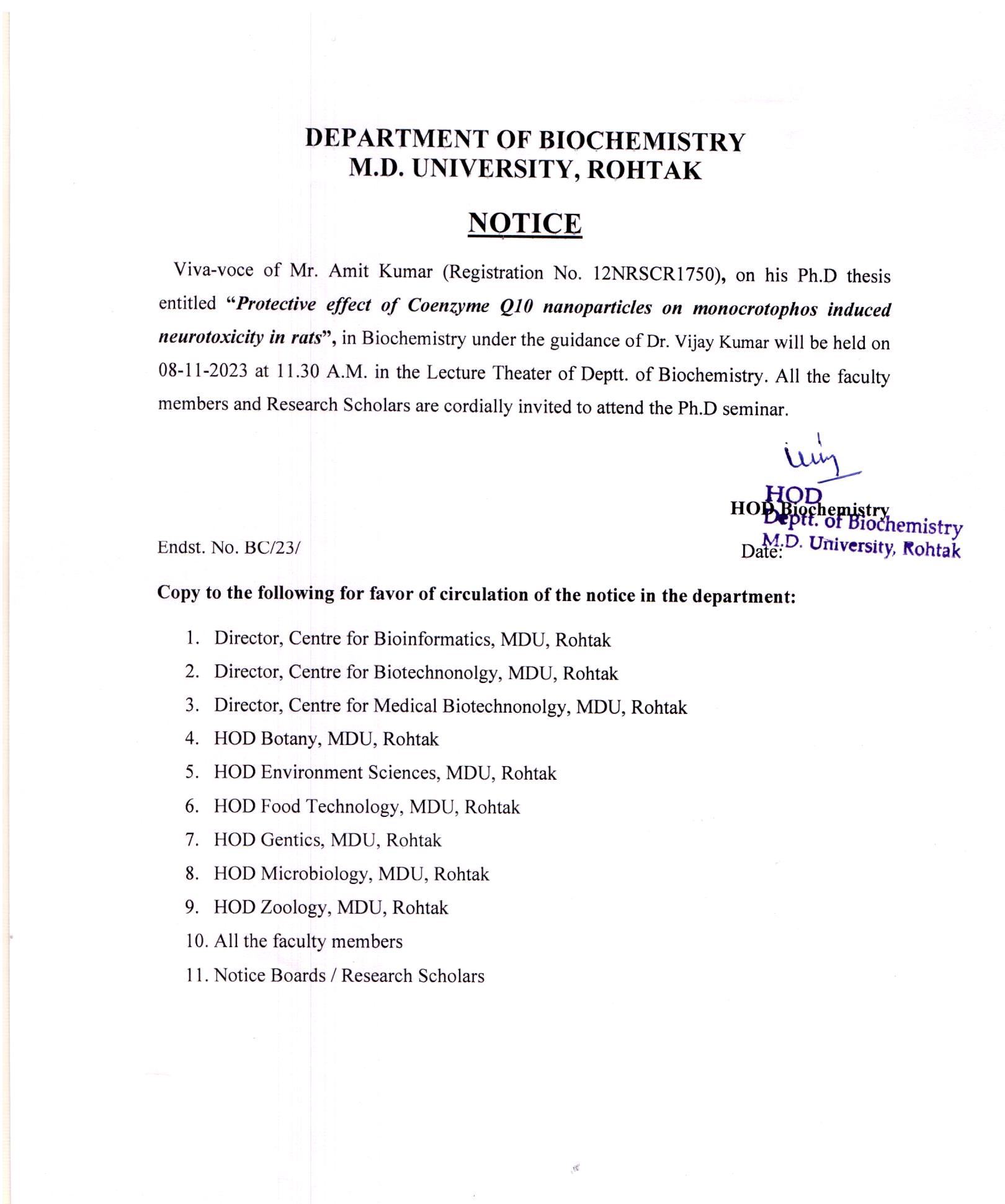 The Department of Biochemistry imparts and disseminates the knowledge of the molecular basis of life and works on the interfacial areas of research. Department will emphasize on excellence in interdisciplinary research to produce highly skilled manpower through: