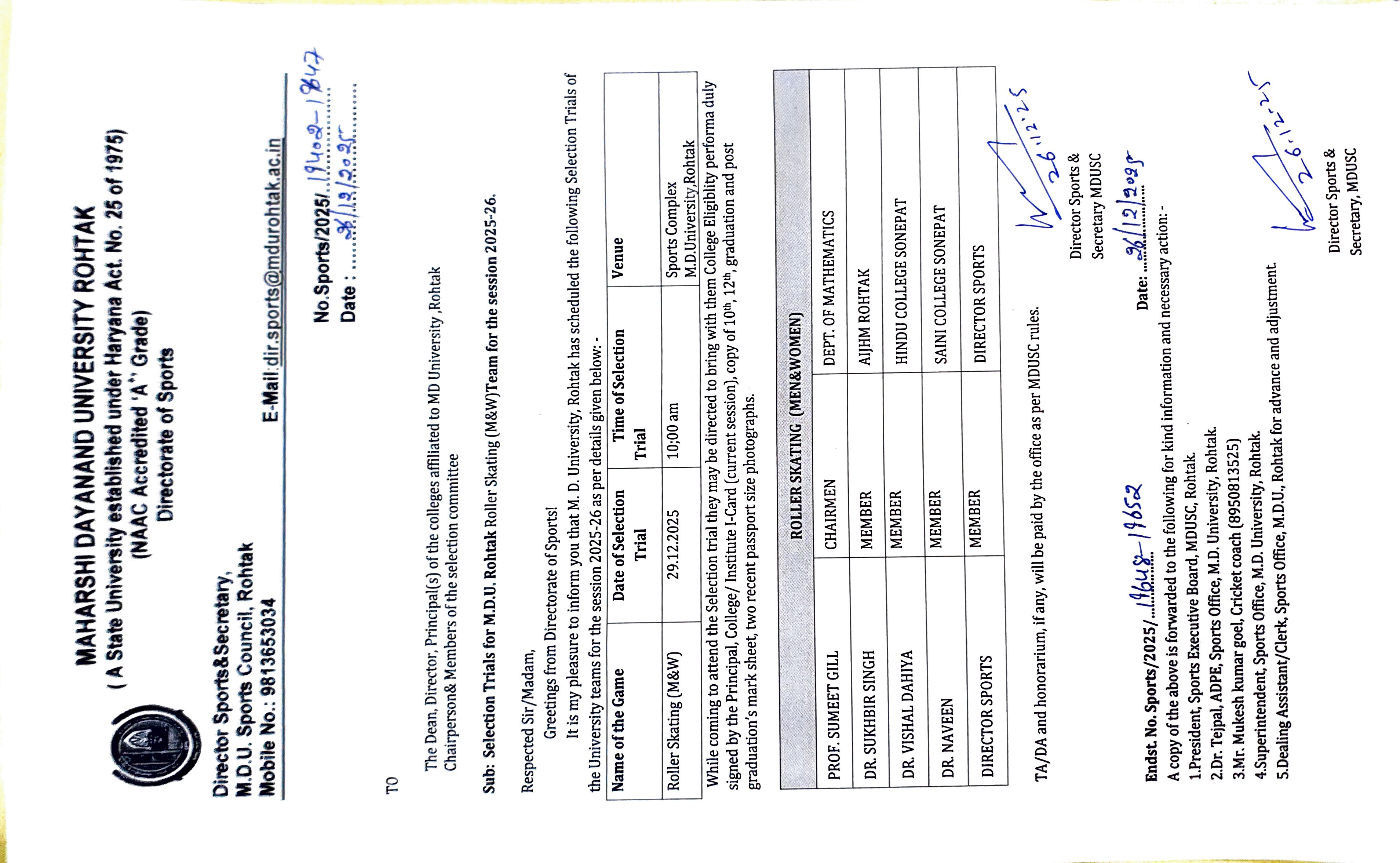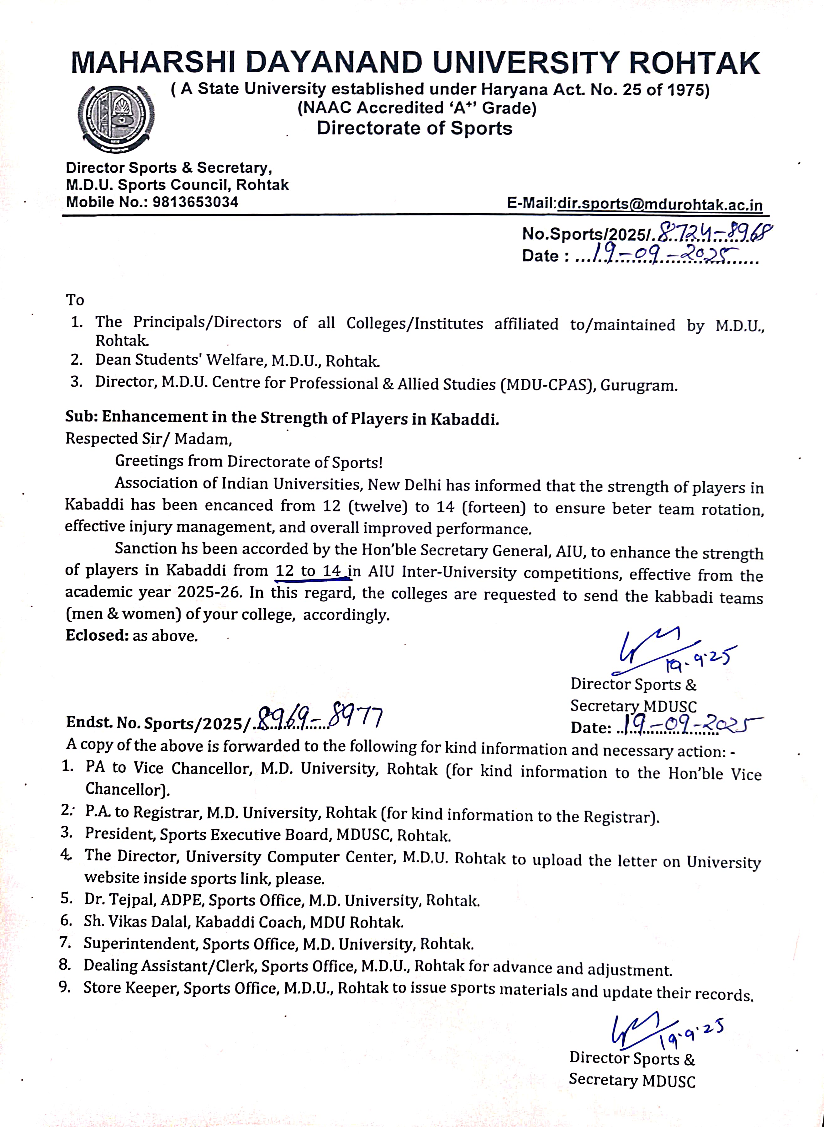 The Directorate of Sports of the University organizes approximate 70 Inter College tournament /games for men and women student players of the University Colleges/Institutes, organize Coaching Camps for selected student players and arrange to send the team in Inter University and World University games/tournaments.