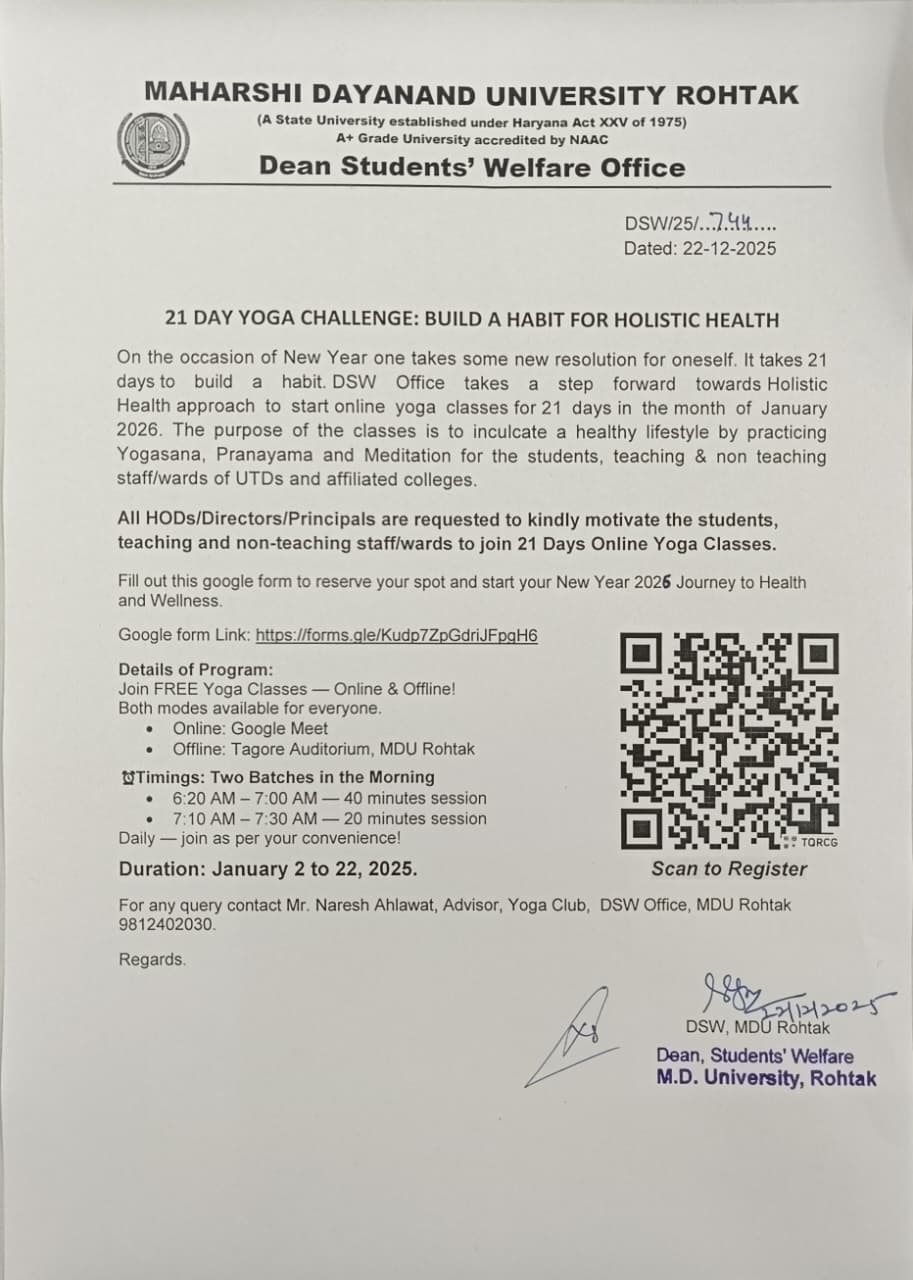 Three Month Yoga Tn in Inter-University Tournaments. Our 59 teams have participated in the North Zone and All India Inter-University Tournaments, Raining Programme.  During Last Five Years 250 students trained under Yoga.  Practice for Inter-College Yoga Tournament  Curative Exercises ailments for Back-Bone Program, Neck Pain and fitness Programme.